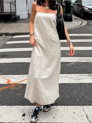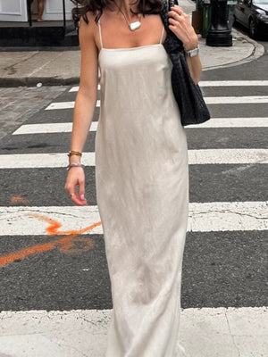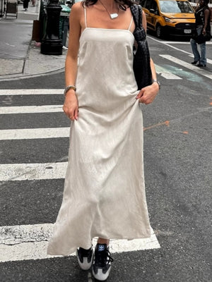 Chic khaki satin slip maxi dress with thin straps and a sleek silhouette, perfect for both casual street style and elegant evening looks.