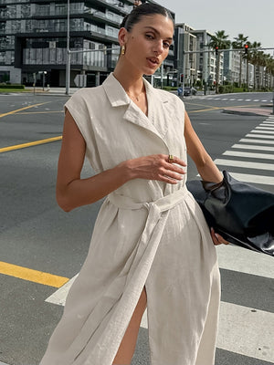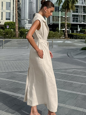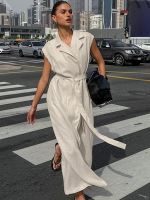 Sophisticated and effortlessly chic, our Khaki Sleeveless Belted Maxi Dress is a versatile wardrobe essential. Crafted from lightweight fabric with a relaxed fit, this dress features a sharp notched collar, sleeveless cut, and a self-tie belt to define the waist