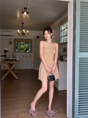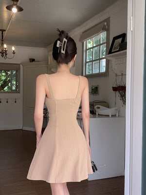 Khaki Square Neck Sleeveless Solid Polyester A-Line Dress