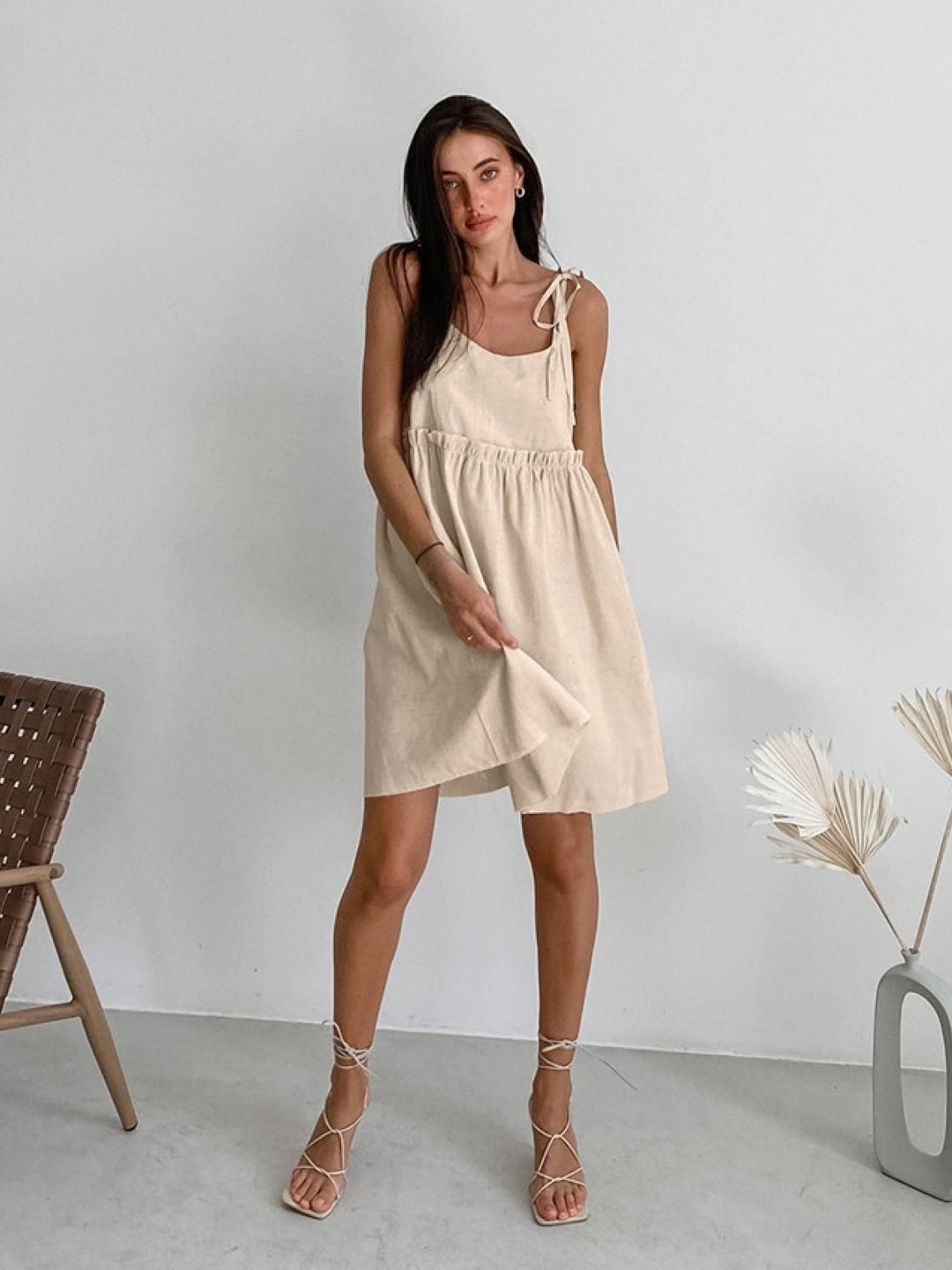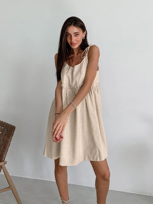 Bring effortless charm to your wardrobe with this khaki mini dress, featuring adjustable tie straps, a relaxed fit, and a breezy silhouette. A versatile piece perfect for casual days or dressing up with accessories.