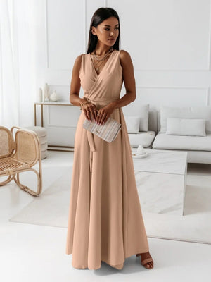 Khaki V-Neck A-Line Sleeveless Solid Maxi Polyester Dress