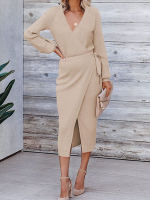 Introducing our khaki v-neck solid long sleeves bodycon polyester knee length dress, a stylish and versatile addition to your wardrobe. The khaki color adds a pop of vibrancy, making it a standout piece in any ensemble.