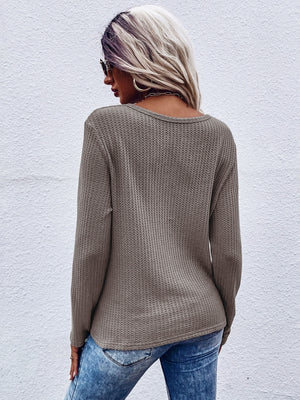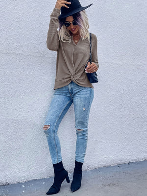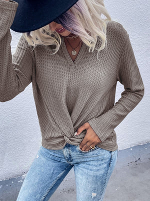 Khaki V-Neck Solid Long Sleeves Cotton Top