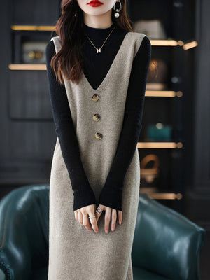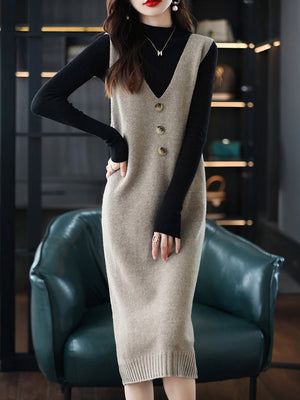 Khaki V-Neck Solid Sleeveless Midi Sheath Acrylic Dress