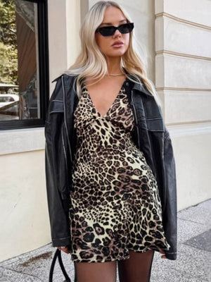 Bold leopard print mini dress featuring a deep V-neckline and a flattering slim fit. Perfect for nights out, parties, or making a statement with chic animal-print style.