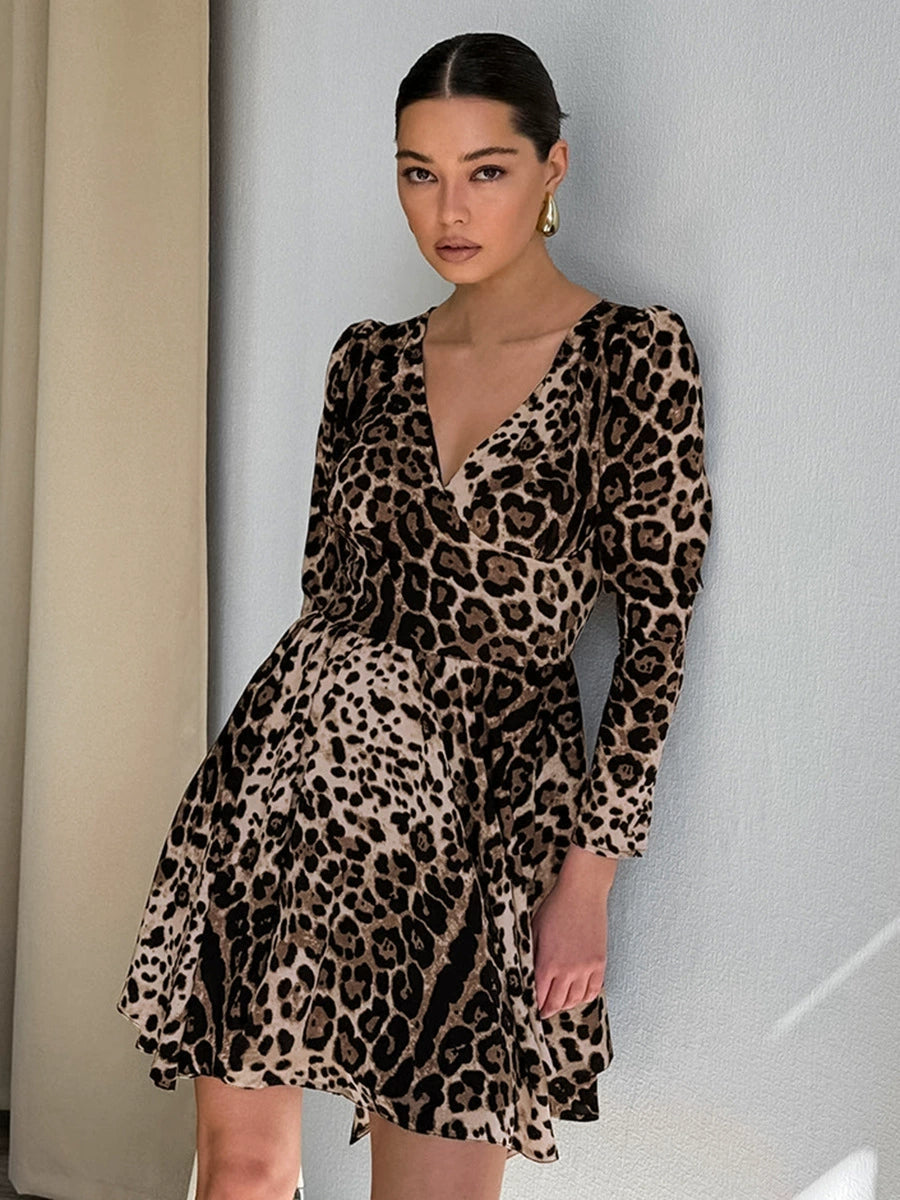 Unleash your wild side with our Leopard Print V-Neck Mini Dress ?the perfect statement piece for bold and confident fashion lovers. Featuring a flattering V-neckline, structured long sleeves, and a playful flared skirt, this dress effortlessly blends fierce and feminine.