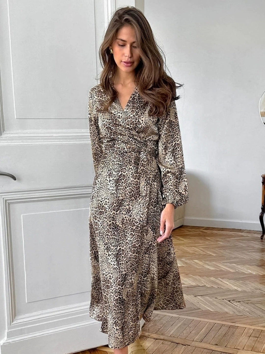 Unleash your wild side with our Leopard Print Wrap Midi Dress in Brown. This effortlessly chic dress features a flattering wrap silhouette that cinches at the waist, creating a feminine shape that's both comfortable and stylish.