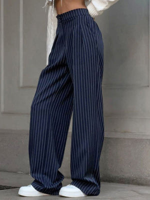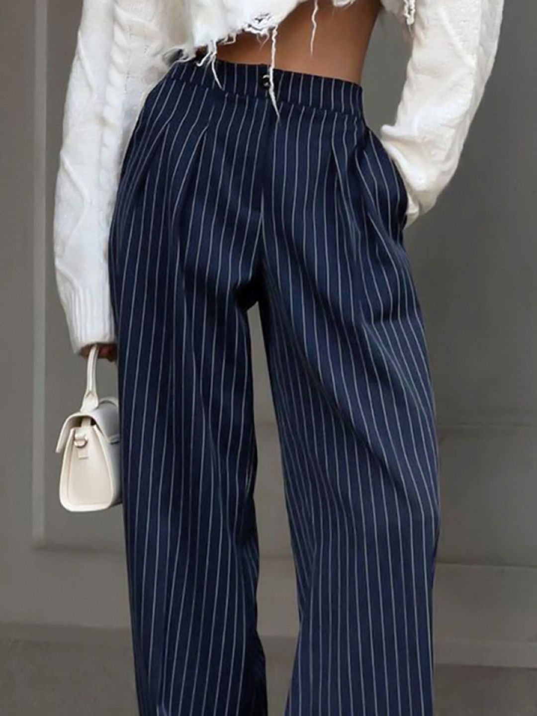 Navy Blue Relaxed Fit Striped Polyester Trouser