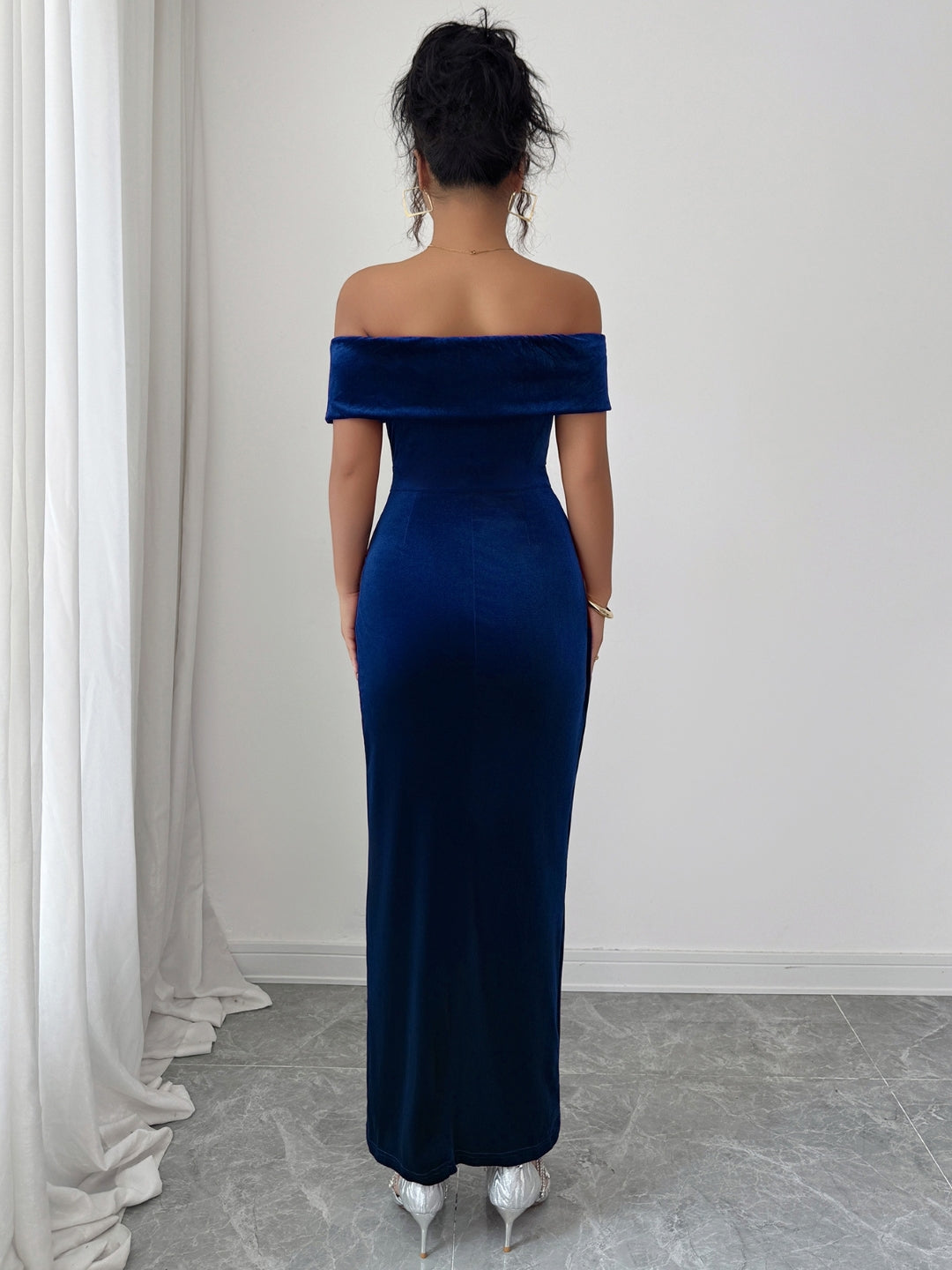 Navy Blue Off-Shoulder Solid Short Sleeves Maxi Bodycon Polyester Dress