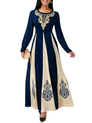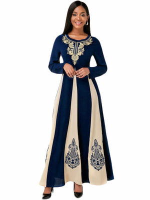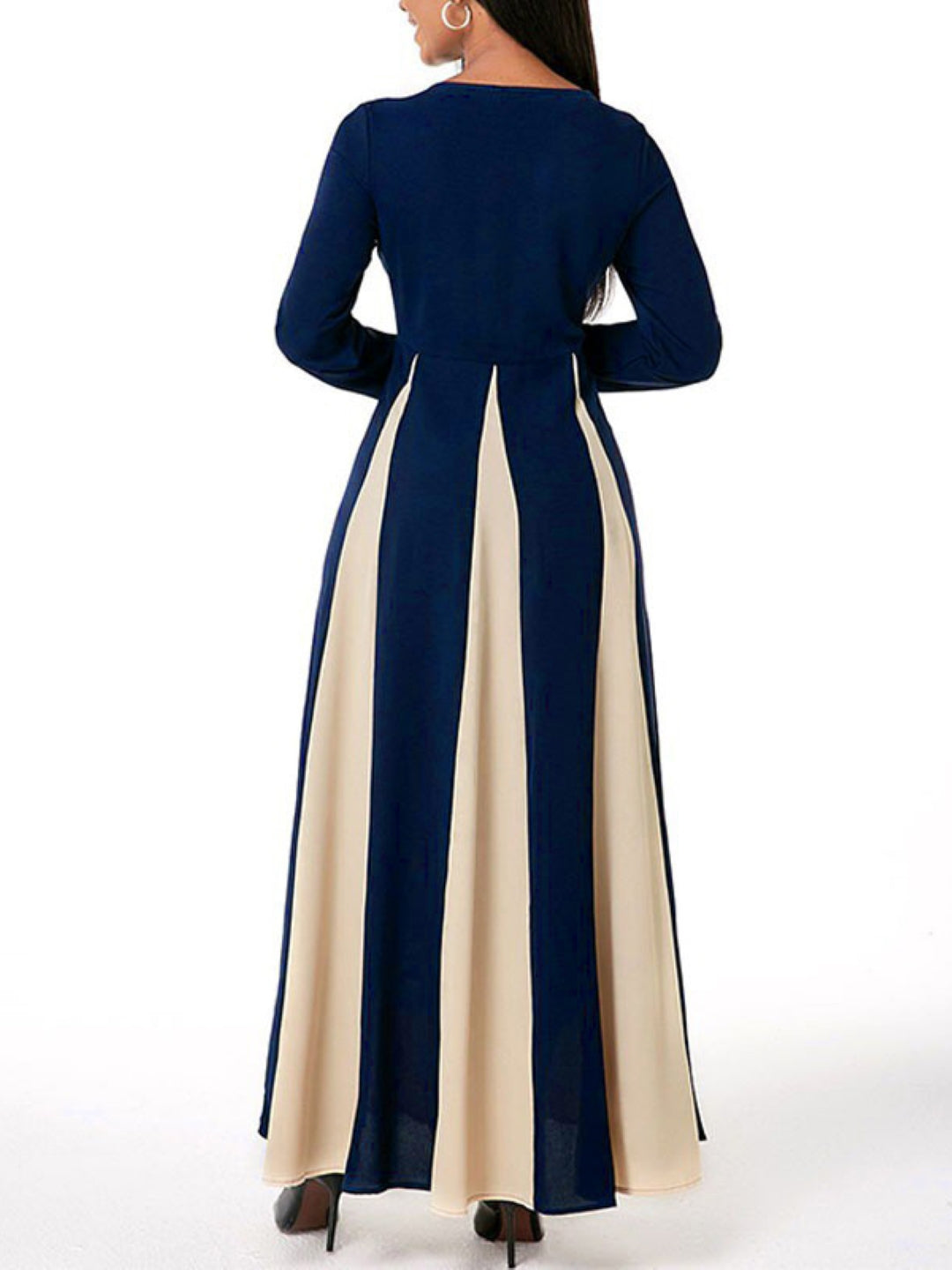 Navy Blue Round Neck Colourblocked Long Sleeves A-Line Polyester Maxi Dress