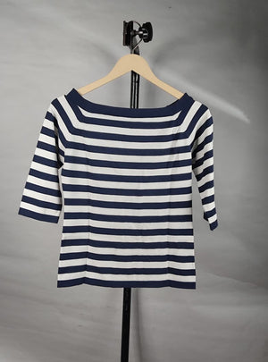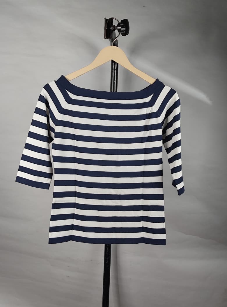 Classic navy blue and white striped scholar collar top with half sleeves. A chic and versatile piece, perfect for casual wear or pairing with jeans and skirts.