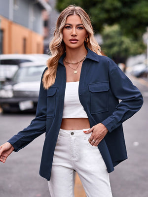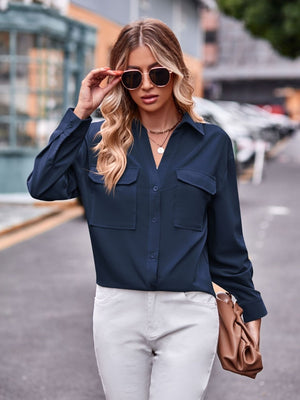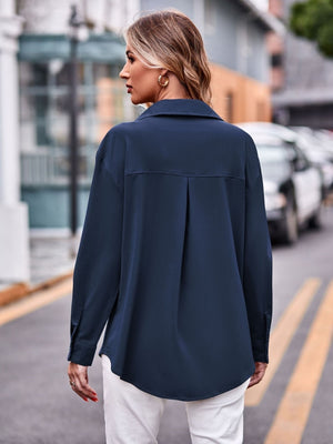 Navy Blue Shirt Collar Long Sleeves Solid Polyester Top