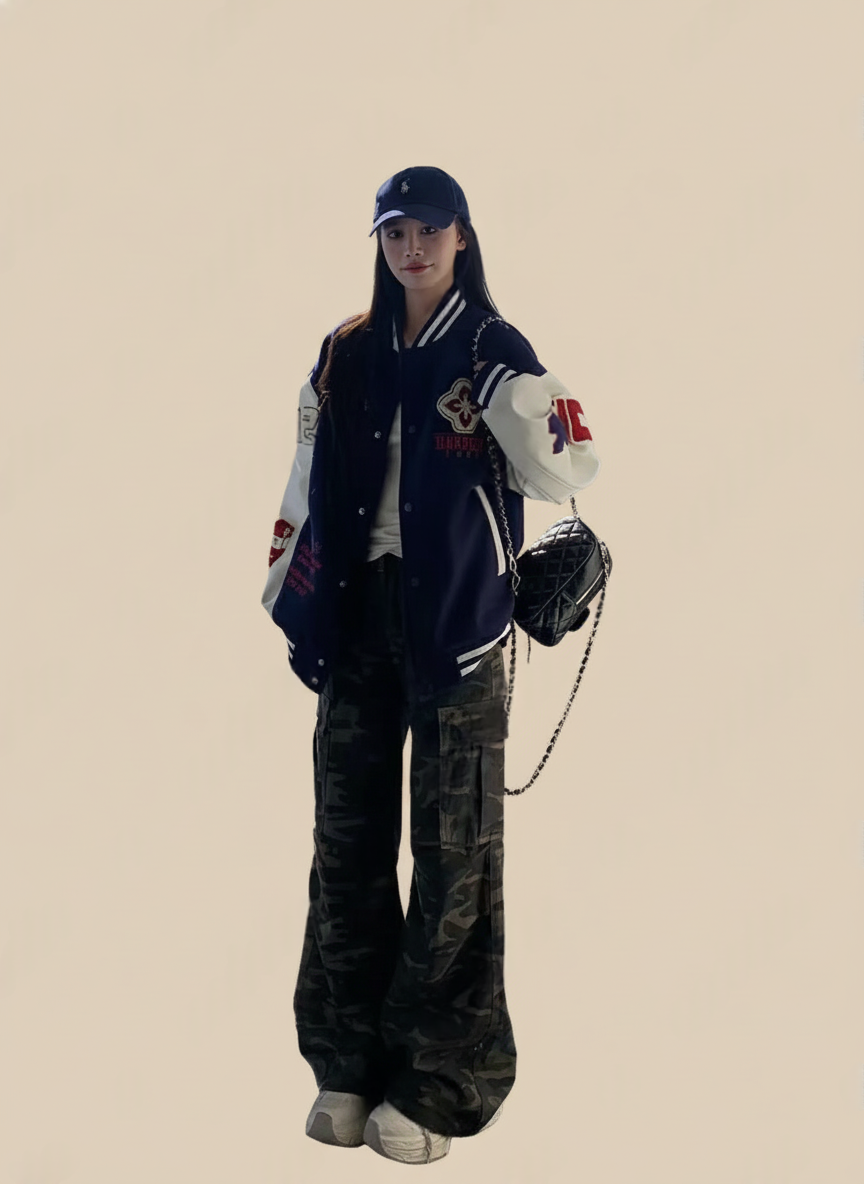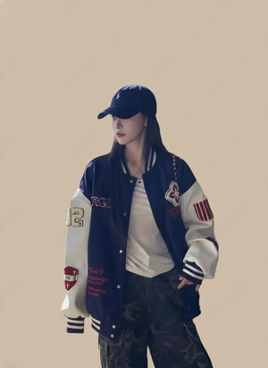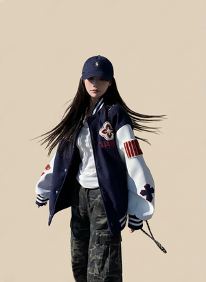 Navy Blue Stand Collar Long Sleeves Printed Polyester Open Front Jacket