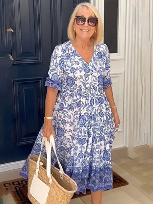 Embrace your feminine side and turn heads with our navy blue v-neck a-line floral short sleeves maxi polyester dress. Crafted from high-quality polyester, this dress offers a comfortable and lightweight feel, perfect for any occasion.