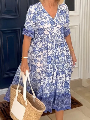 Navy Blue V-Neck A-Line Floral Short Sleeves Maxi Polyester Dress