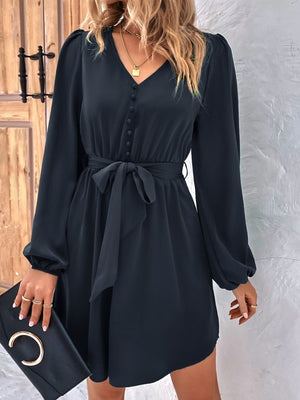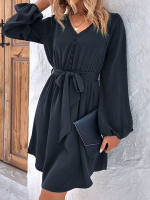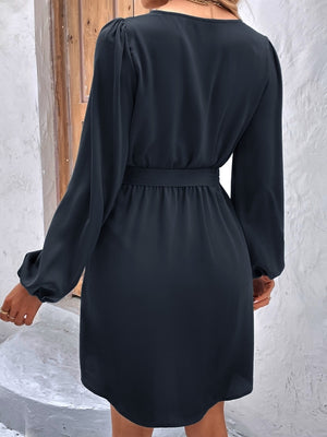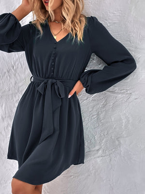 Navy Blue V-Neck Solid Long Sleeves Polyester Dress