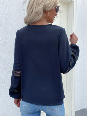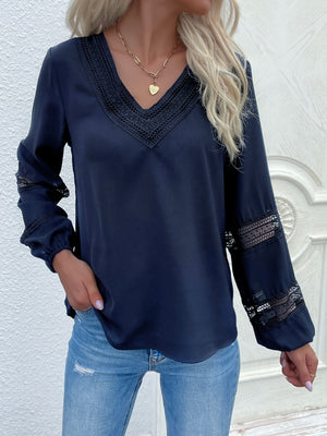 Navy Blue V-Neck Solid Long Sleeves Polyester Top