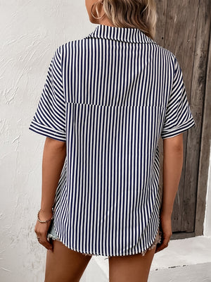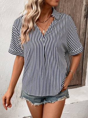 Navy Blue V-Neck Striped Short Sleeves Polyester Top