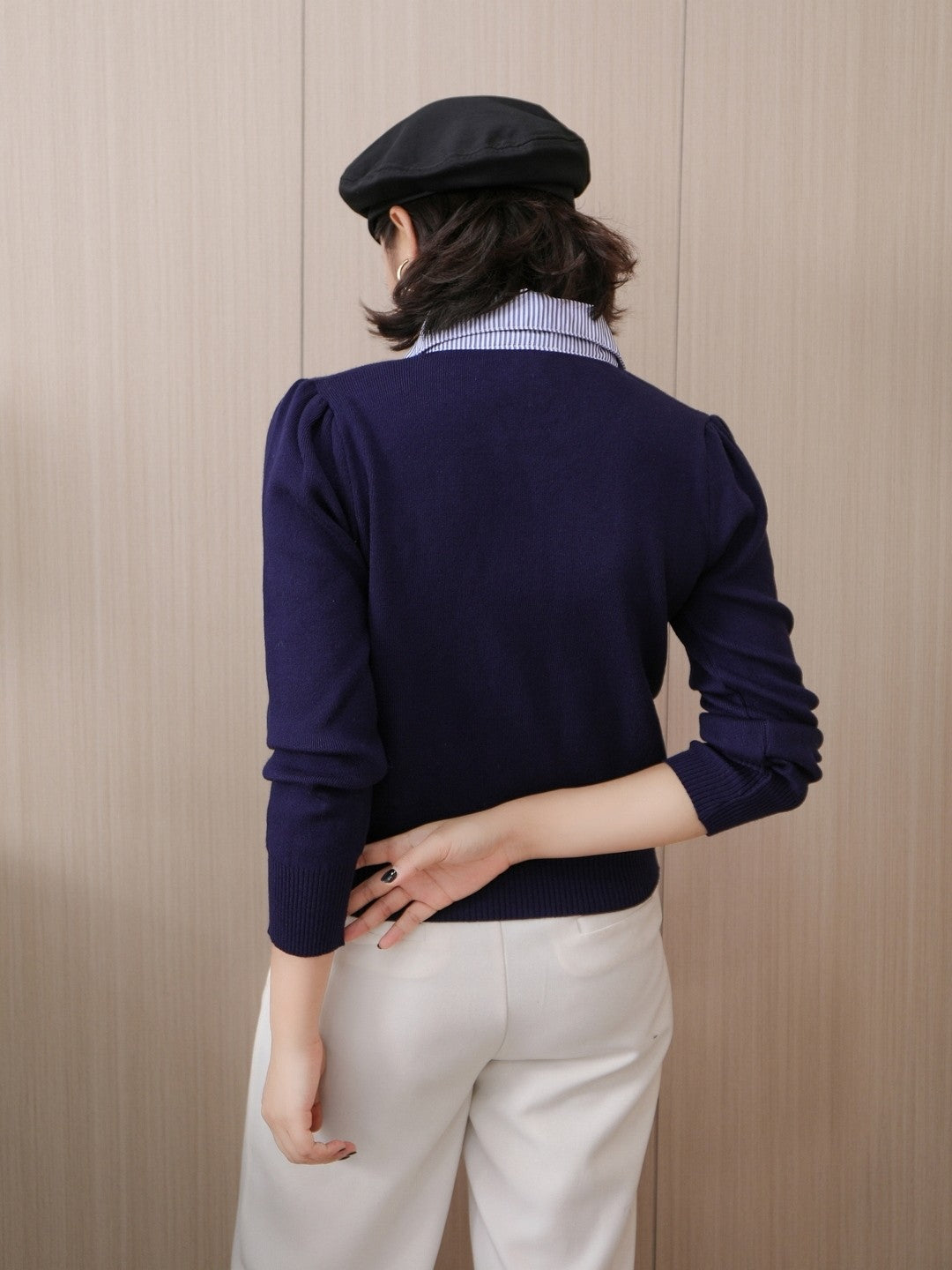 Navy Blue Viscose Rayon Shirt Collar Long Sleeves Solid Top