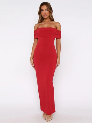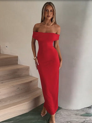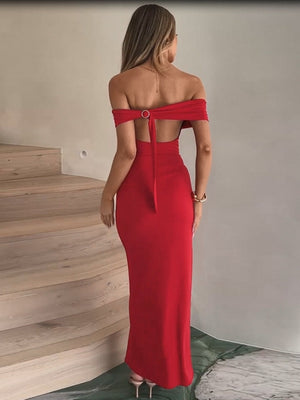 Command attention with our Off-Shoulder Bodycon Maxi Dress in a striking red hue. This elegant dress features a flattering off-the-shoulder neckline, ruched sleeve detail, and a sleek, form-fitting silhouette that flows to the floor. Perfect for formal events, romantic dinners, or special occasions, this bold and timeless piece adds sophistication and allure to your wardrobe.