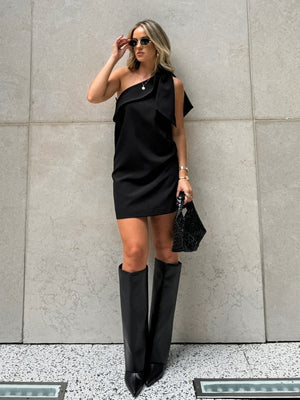 Turn heads with our chic one shoulder mini dress in classic black. Featuring a sleek asymmetrical neckline with statement bow detail, this dress is perfect for nights out, special events, or a stylish date night. Pair it with knee-high boots or heels for a bold, confident look. Made with soft, flattering fabric that hugs your shape while keeping it comfortable and elegant all night long.