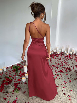 One Shoulder Satin Maxi Dress - Red