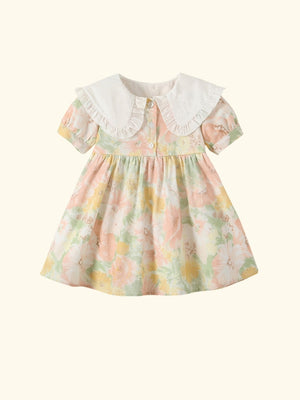 Orange A-Line Round Neck Floral Short Sleeves Cotton Dress
