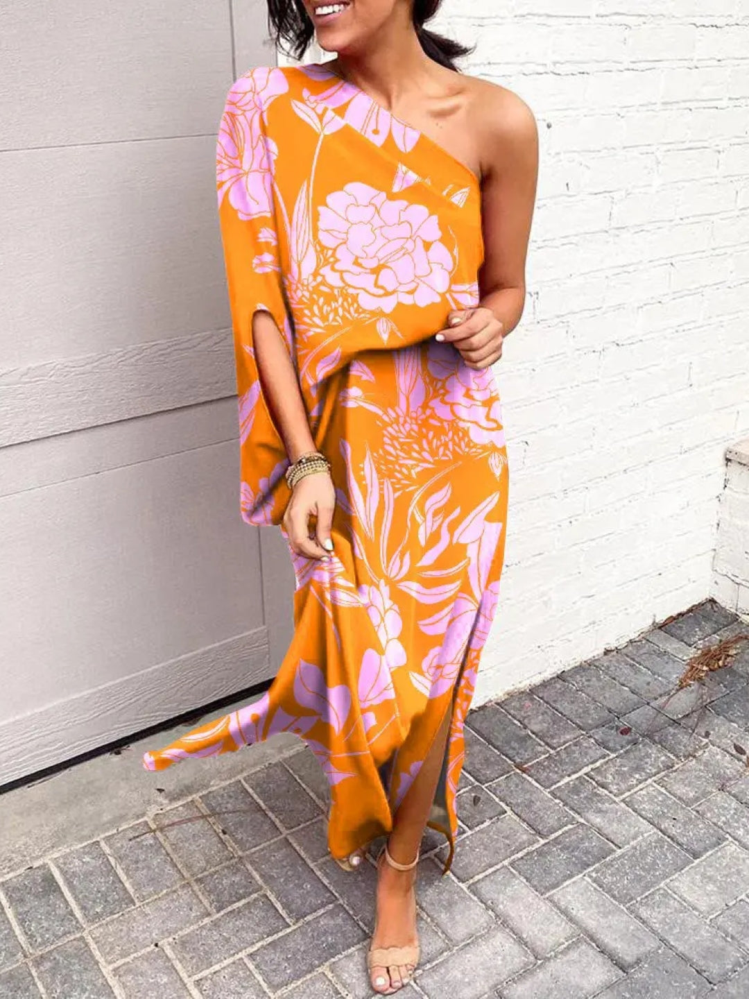 Orange One Shoulder Floral Sleeveless A-Line Polyester Maxi Dress