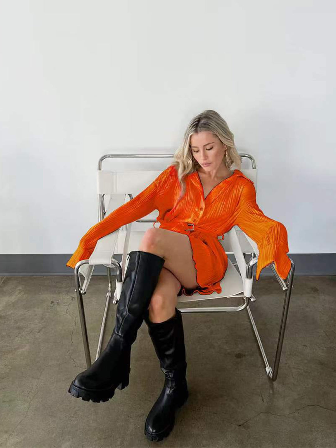 Embrace your feminine side and turn heads with our orange shirt collar a-line solid long sleeves above knee polyester dress. Crafted from high-quality polyester, this dress offers a comfortable and lightweight feel, perfect for any occasion.