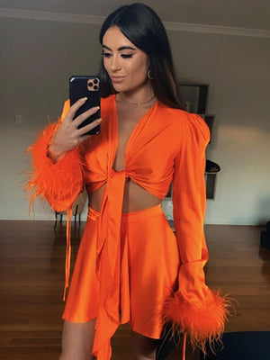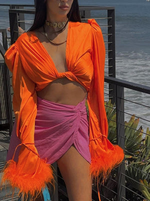 Orange V-Neck Solid Long Sleeves Polyester Top