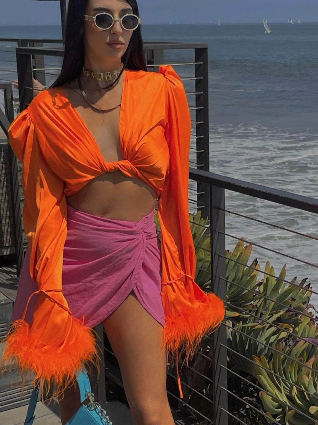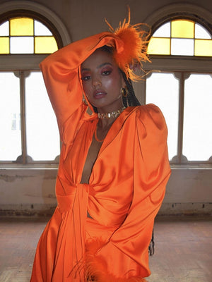 Introducing our Orange V-Neck Solid Long Sleeves Polyester Top, a stylish and versatile addition to your wardrobe. Made from high-quality polyester fabric, this top offers a comfortable and breathable fit. The v-neck design adds a touch of elegance, while the black color provides a timeless and sophisticated look.