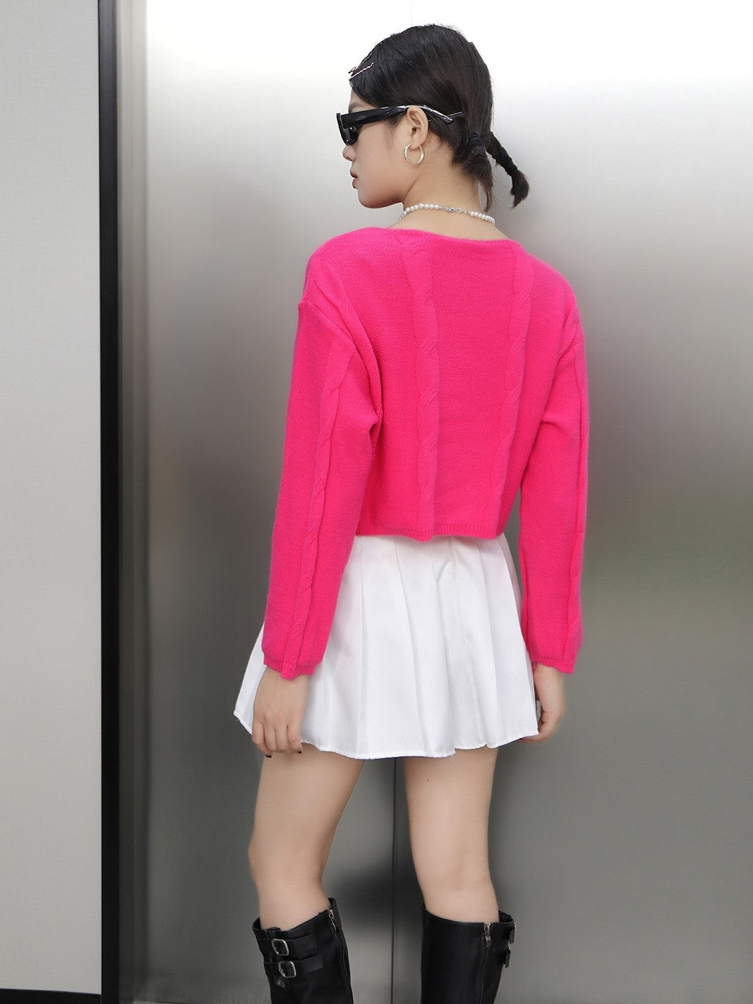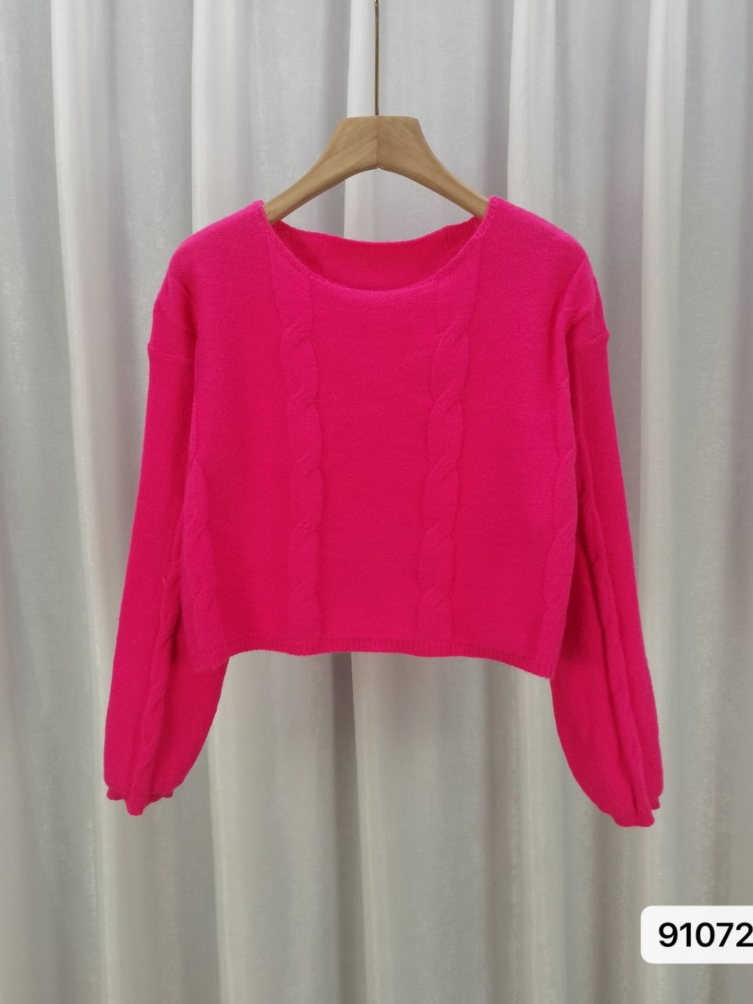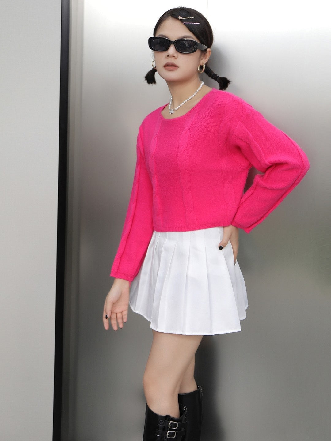 Pink Acrylic Round Neck Long Sleeves Solid Top