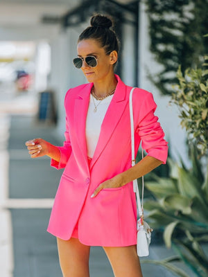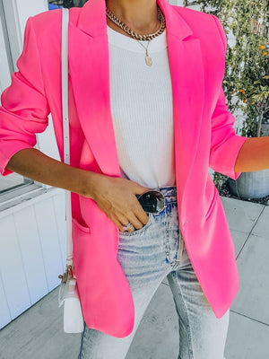 Introducing our Pink Lapel Collar Three-Quarter Sleeves Solid Polyester Open Front Jacket, a stylish addition to your wardrobe.