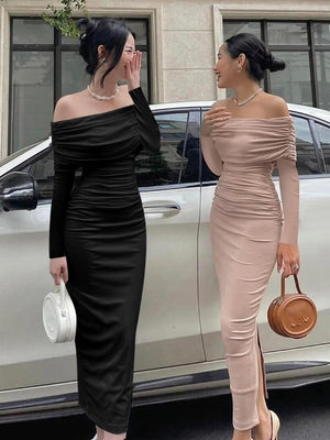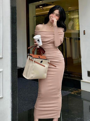 This Pink Off Shoulder Solid Long Sleeves Maxi Bodycon Polyester Dress is ideal for any special event. The elegant design and bodycon fit highlight your curves, with the details adding a touch of allure. Crafted from high-quality polyester fabric, this dress is both comfortable and chic.
