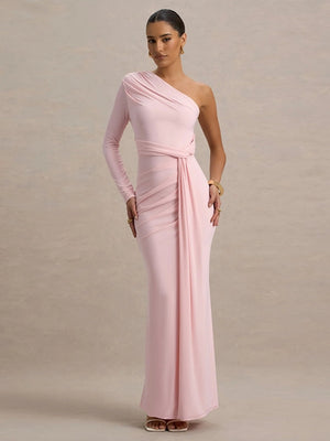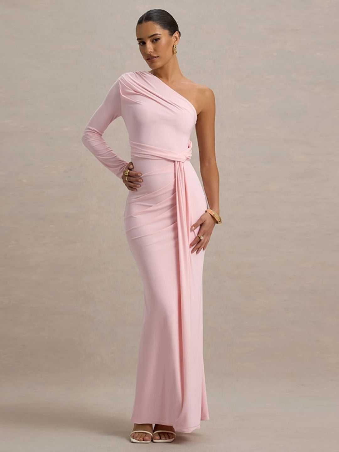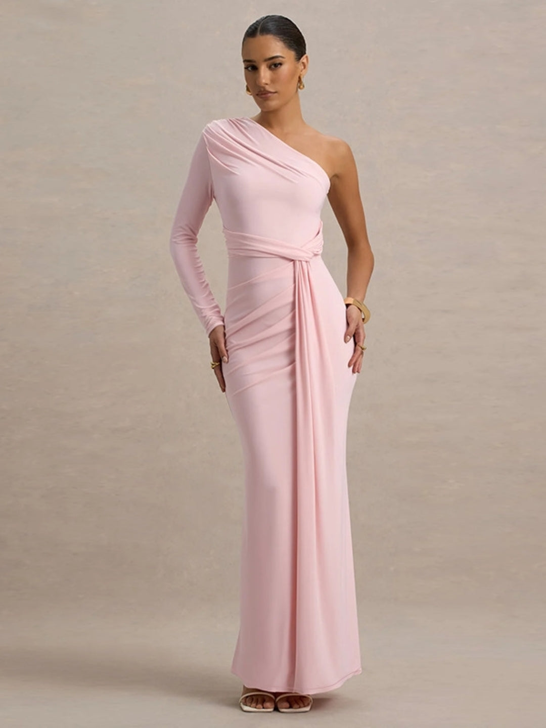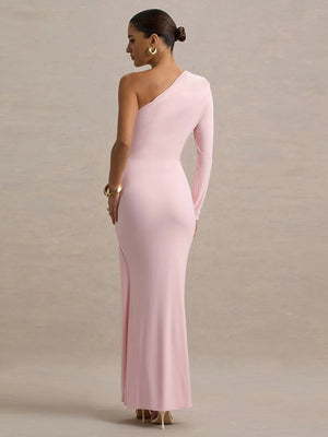 Pink One Shoulder Solid Long Sleeves Maxi Bodycon Polyester Dress