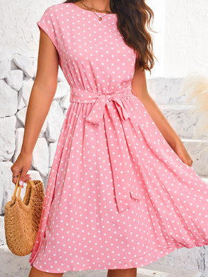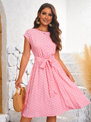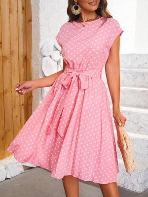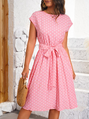 Pink Round Neck A-Line Polka Dots Short Sleeves Knee Length Polyester Dress