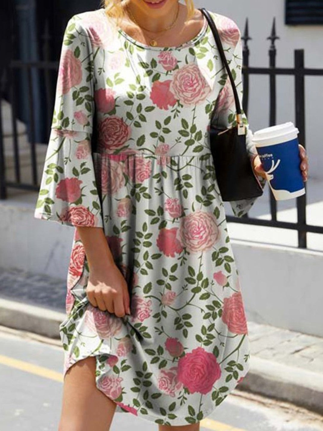 Pink Round Neck A-Line Three-Quarter Sleeves Floral Knee Length Polyester Dress