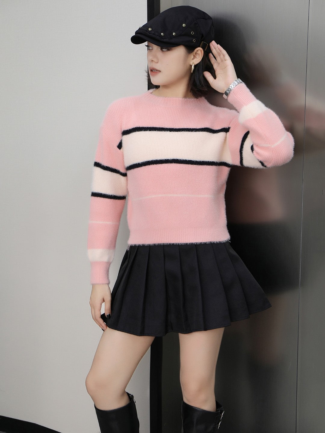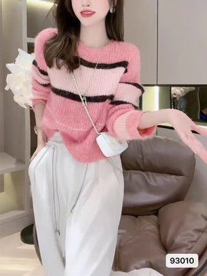 Pink Round Neck Long Sleeves Horizontal Stripes Regular Sleeves Nylon Top