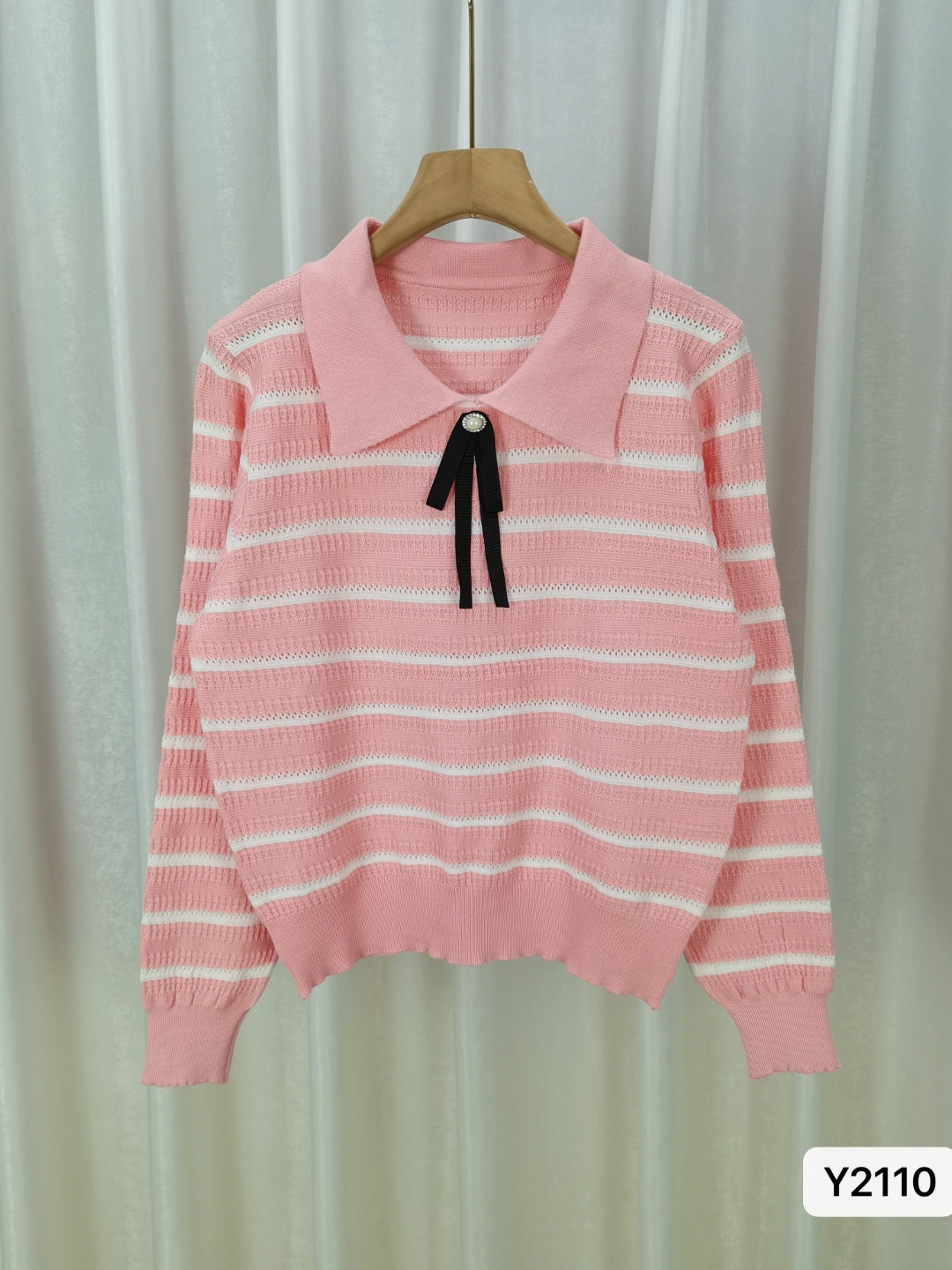 Pink Round Neck Long Sleeves Horizontal Stripes Regular Sleeves Viscose Rayon Top