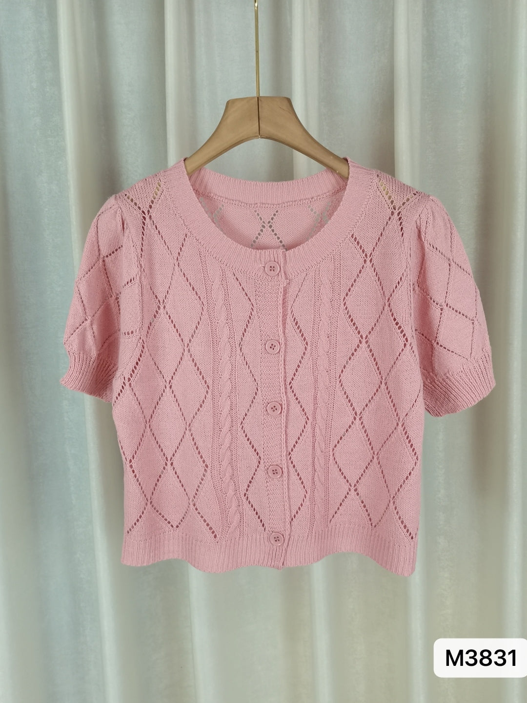 Pink Round Neck Short Sleeves Solid Regular Sleeves Acrylic Top