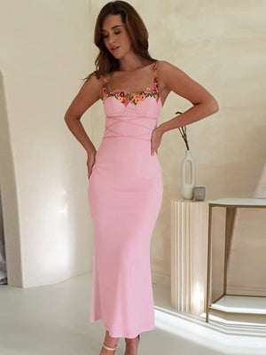 Pink Shoulder Straps Solid Sleeveless Maxi Bodycon Polyester Dress