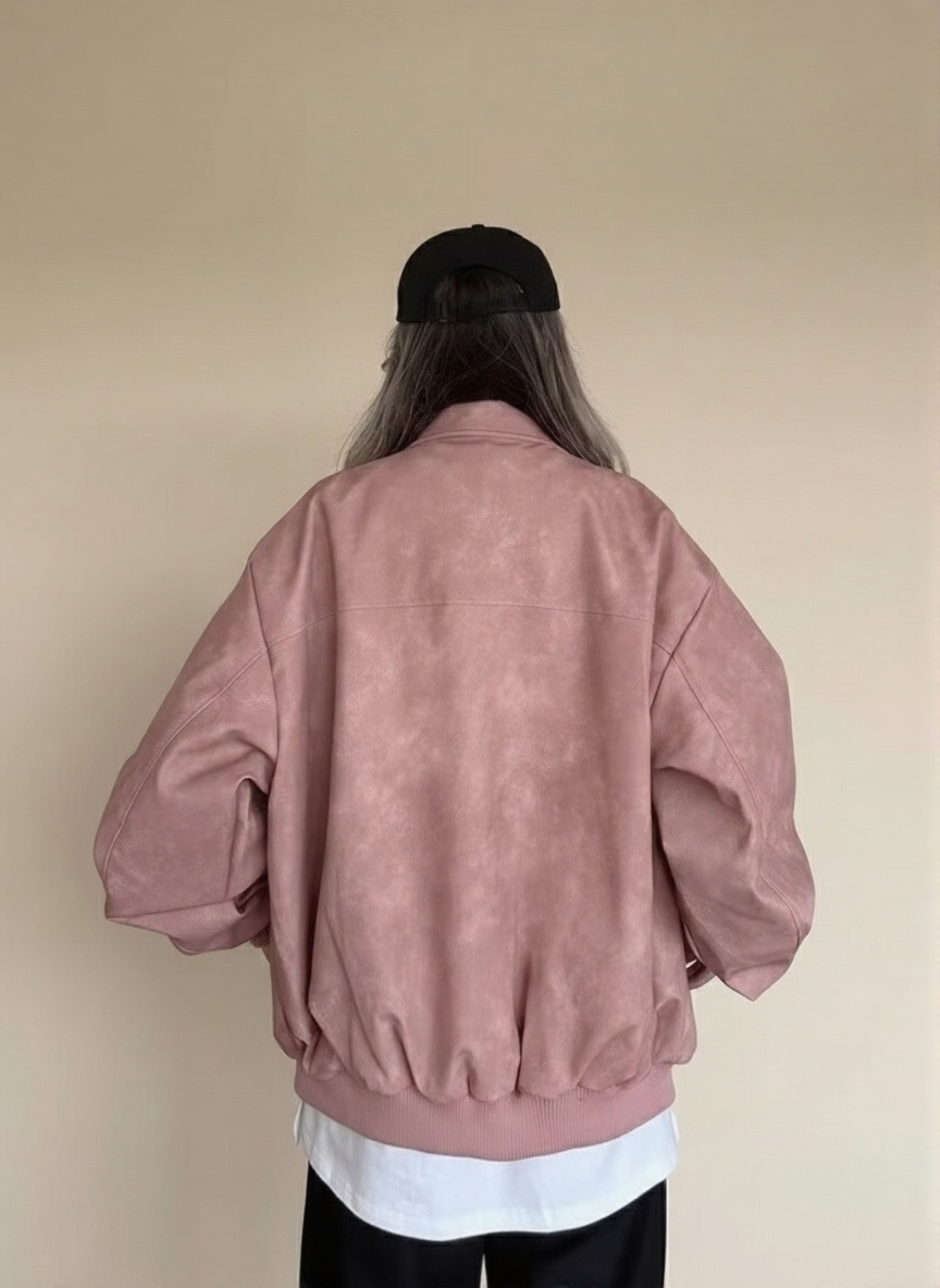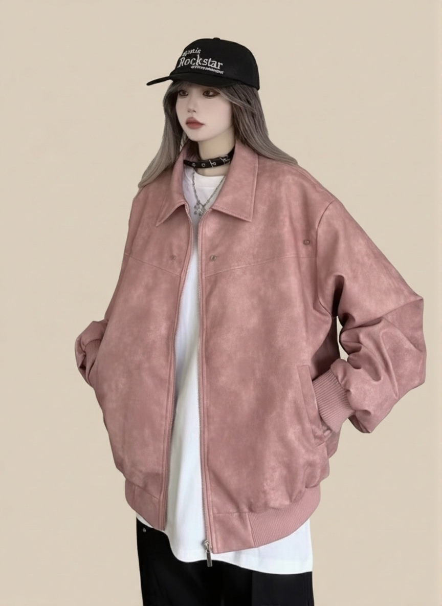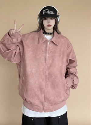 Pink Spread Collar Long Sleeves Printed Polyester Open Front Jacket