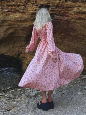 Pink Square Neck Printed Long Sleeves Midi A-Line Polyester Dress