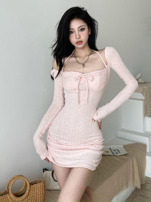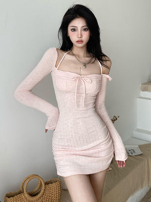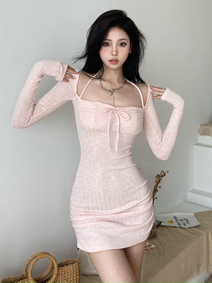 Pink Square Neck Solid Bodycon Above Knee Long Sleeves Polyester Dress