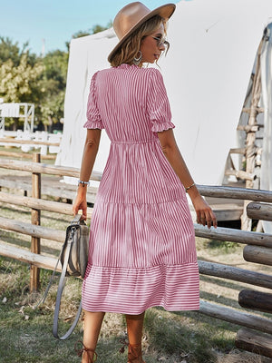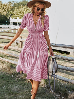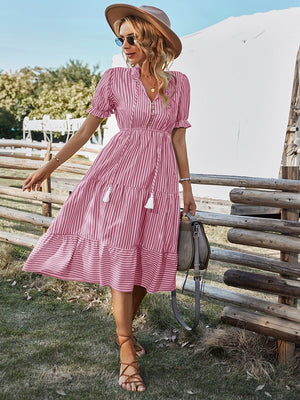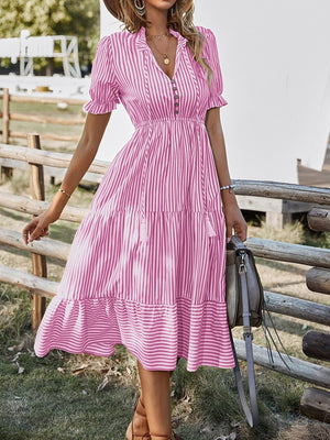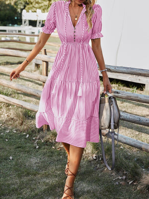 This elegant A-Line dress is made from high-quality pink polyester, perfect for any occasion. The flattering silhouette and versatile color make it a must-have in any wardrobe. The dress features a classic v-neck neckline and a comfortable fit that will make you feel confident and stylish.