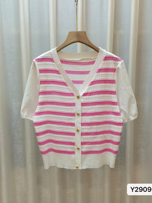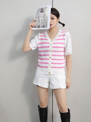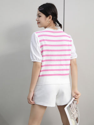 Pink V-Neck Short Sleeves Horizontal Stripes Top