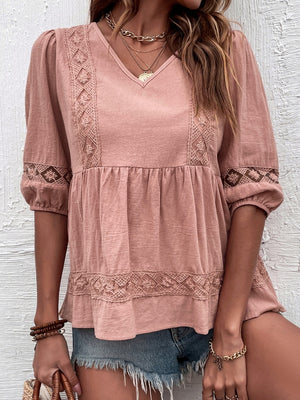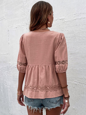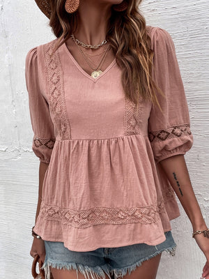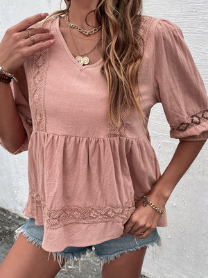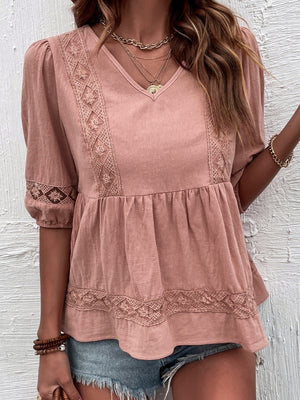Pink V-Neck Solid Short Sleeves Polyester Top