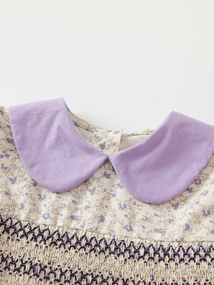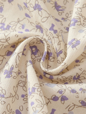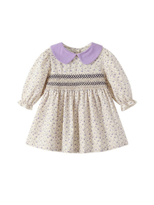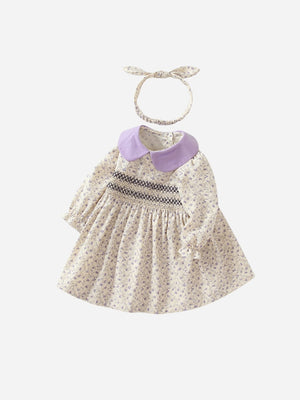Purple A-Line Round Neck Floral Long Sleeves Cotton Dress