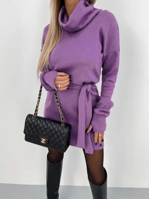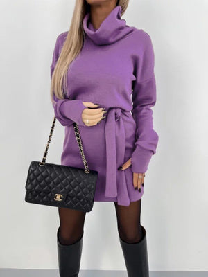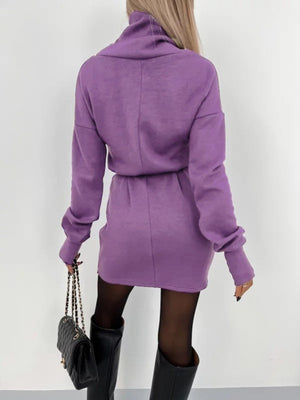 Purple High Neck Solid Long Sleeves Fit and Flare Polyester Above Knee Dress
