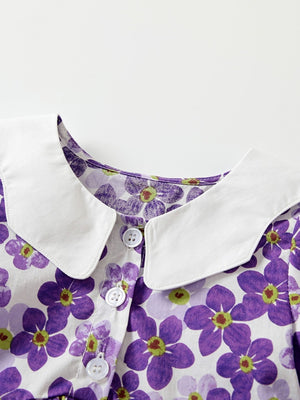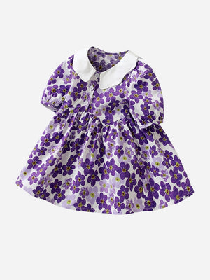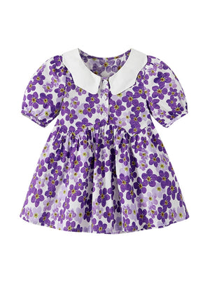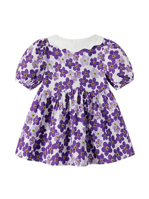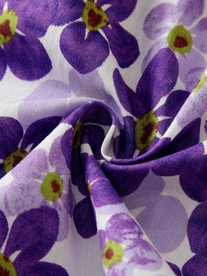 Purple Round Neck Casual A-Line Floral Short Sleeves Knee Length Cotton Dress